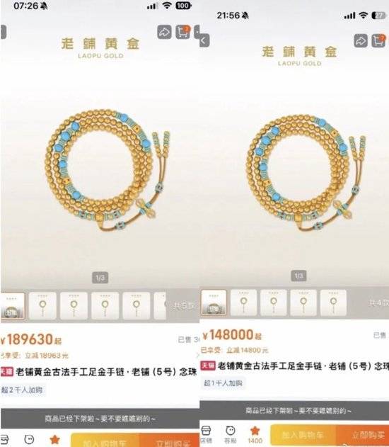一夜涨了4万多元的108念珠,也是老铺黄金最火的一款产品之一。一条念珠102克左右,从此前的148000元涨到了189630元,涨幅为28%左右。而就在年前,同样一条念珠的公价为9万元左右,一年时间涨了近10万元。