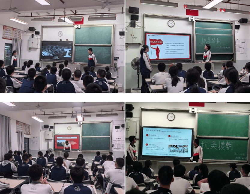 各班围绕“抗美援朝”主题设计并开展了形式多样的学习活动。有的班级播放抗美援朝题材纪录片片段与经典影片节选,通过真实的战争画面、震撼的历史场景,展现志愿军战士在极端艰苦条件下保家卫国、浴血奋战的英勇身姿,让同学们直观感受战争的残酷与英雄的无畏;有的班级组织“英雄事迹分享会”,讲述黄继光、邱少云、杨根思等英雄人物的感人事迹,结合历史资料解读抗美援朝精神的核心内涵,同时开展小组讨论,让同学们分享感悟、交流心得,在思想碰撞中深化对英雄精神的理解。这些活动不仅帮助同学们筑牢历史记忆,更让红色精神在互动与思考中真正入脑入心。