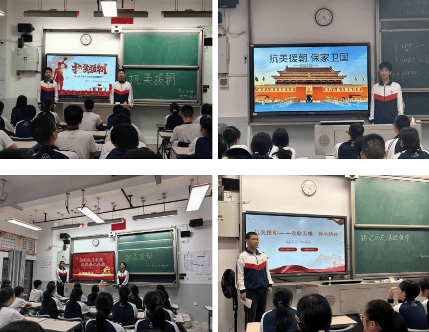 高二4班 刘筱霏:今日班会围绕“抗美援朝”展开,那段烽火岁月如画卷般在眼前重现。听着黄继光以身躯堵枪眼、邱少云在烈火中永生的故事,我深感震撼。这不仅是历史课本上的文字,更是先辈用热血铸就的丰碑。他们当年与我们年纪相仿,却肩负起保家卫国的重任,在异国他乡的冰天雪地里浴血奋战。是什么支撑着他们在极寒中坚守?是“保和平,卫祖国”的坚定信念,是对家园和亲人最深沉的爱。如今我们沐浴在和平的阳光下,更应铭记这段历史。抗美援朝精神不是尘封的记忆,而是激励我们前行的力量。作为新时代青年,我们当以先烈为榜样,将爱国情怀化为求知动力,用知识建设更强大的祖国,让先辈的牺牲更有价值。历史不容遗忘,精神永续传承。这次班会让我深刻认识到,和平来之不易,吾辈当自强不息!
